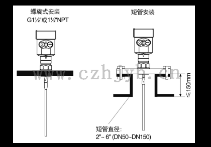 導波雷達物位計可采用螺紋連接,螺紋的長度不要超過15mm,還可以采用在短管上安裝。安裝短管直徑在2″至6″則安裝短管高度應≤100mm(螺紋及短管的長度越短,測量越穩(wěn)定),若安裝短管較長,理想狀態(tài)應將短管割短,或底部固定纜式探頭及選用絕緣對中支架以避免纜式探頭與短管末端接觸。