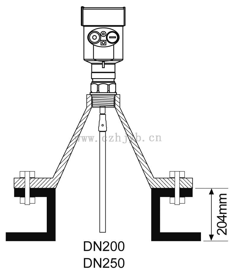 當導波雷達需要安裝于直徑大于200mm短管時,短管內(nèi)壁產(chǎn)生回波,在介質介電常數(shù)低的情況下會引起測量誤差。因此,對于一個直徑為200mm或250mm的短管,需要選一個帶“喇叭接口”的特殊法蘭。