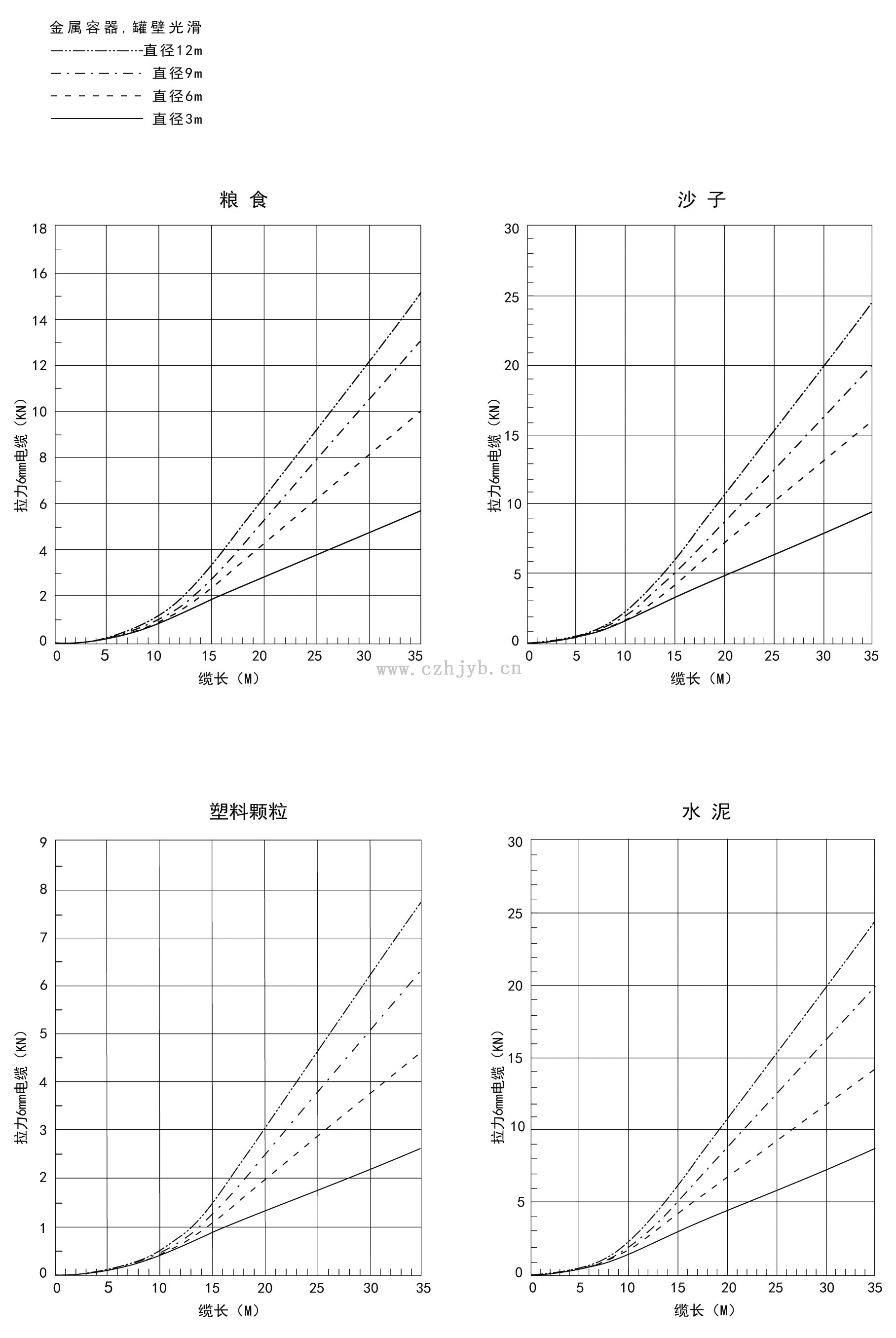 在測量固體介質的時候,拉力取決于容器直徑和物位,以下顯示的是一些典型介質產(chǎn)生的拉力。